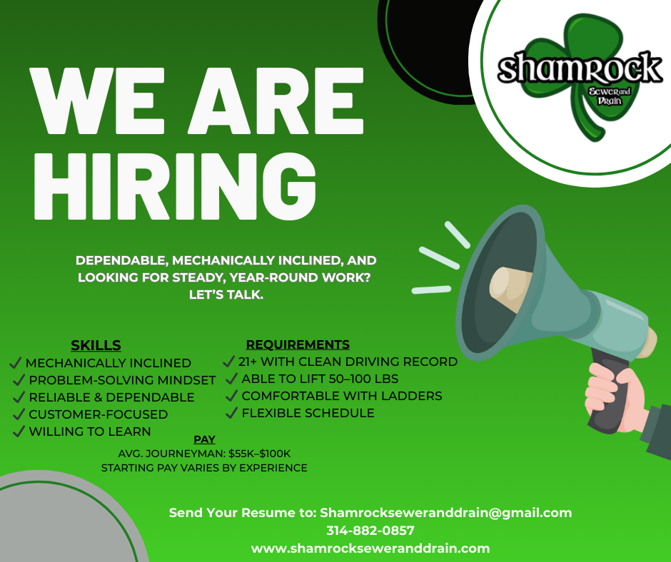 Shamrock Sewer & Drain takes pride in our honesty and integrity. We always treat our customers and their property respectfully. We are proud members of Plumbers and Pipefitters Local 562 in St. Louis, MO.